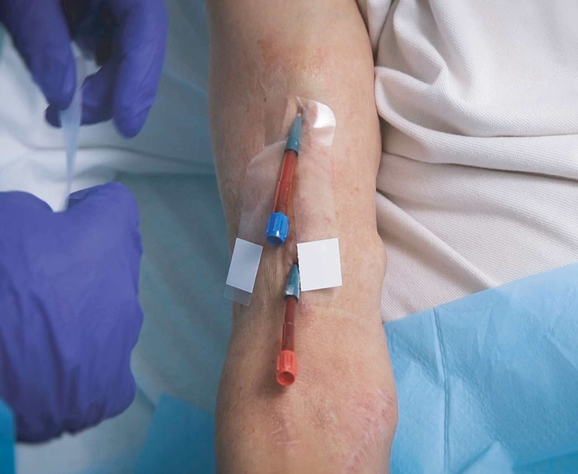 4 – Cruze os 2 braços sobre a base do cateter de fístula e fixe-os na pele.