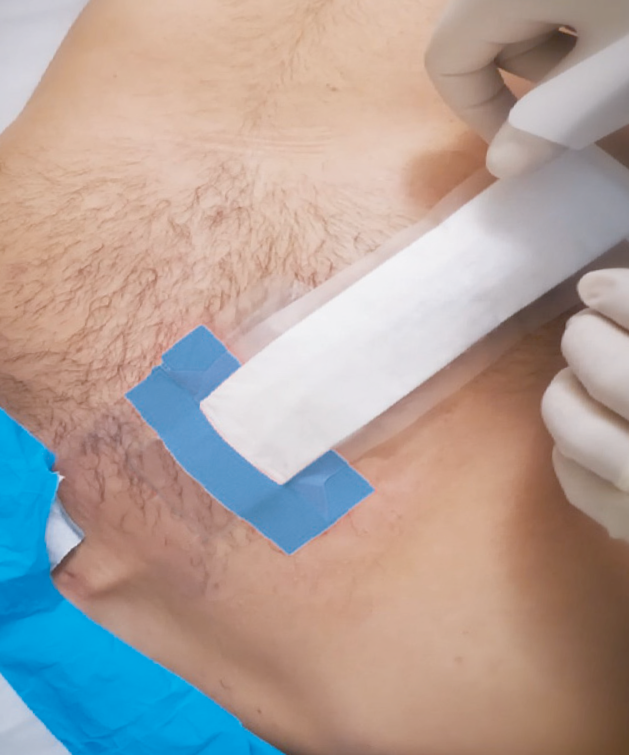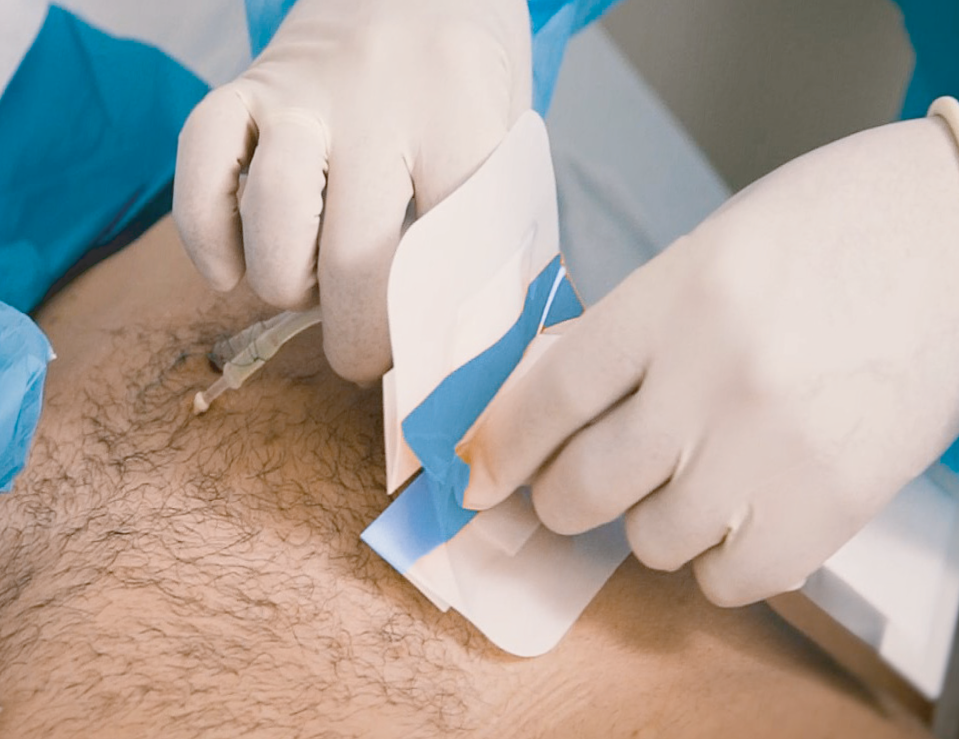 1 – Deslize as extremidades do cateter para dentro da bolsa e até os pontos de inserção. Coloque a fita adesiva do lado da pele se quiser ver o local de saída. Caso contrário, coloque a fita adesiva do outro lado.