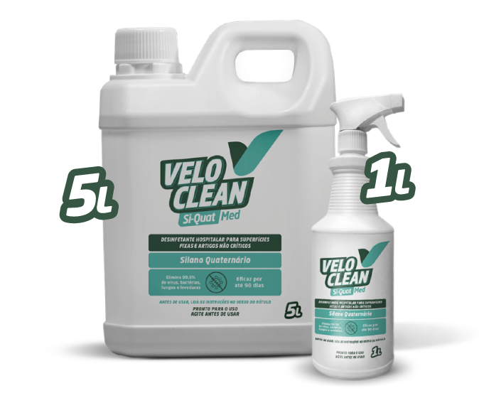 O Velo Clean Si-Quat Med é um desinfetante para superfícies fixas que tem ação fungicida e bactericida, eliminando vírus, bactérias, fungos e leveduras. Ele pode ser aplicado em superfícies como pisos, paredes, tecidos, metais, madeira e derivados, vidros, etc.